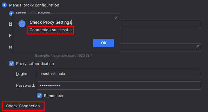 To verify the IntelliJ proxy configuration, enter any URL and click “Check connection”. If the setup is correct, the IDE displays a successful connection message.