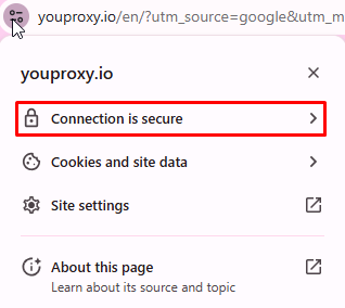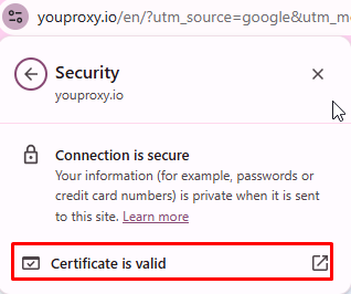 Open the required resource in a browser, for example Artifactory, Nexus, or any HTTPS endpoint routed through the proxy. Click the security icon near the address bar and select the item that shows the secure connection details.