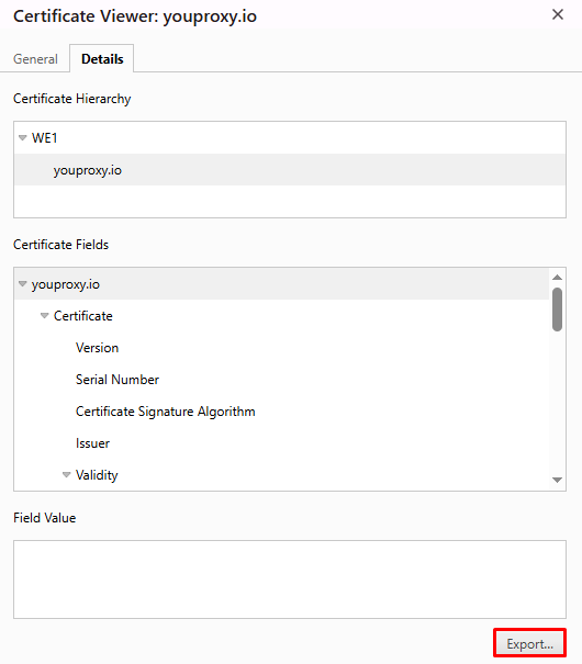 In the certificate viewer, select the required certificate and export it as a .cer or .crt file.