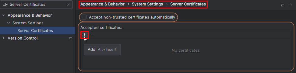 After the export, open IntelliJ IDEA and navigate to “File → Appearance & Behavior → System Settings → Server Certificates”. Click Add and choose the previously exported certificate file.