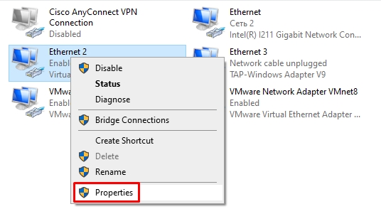 In the list of network connections, find the one your PC uses to access the internet. Right-click it and select Properties.