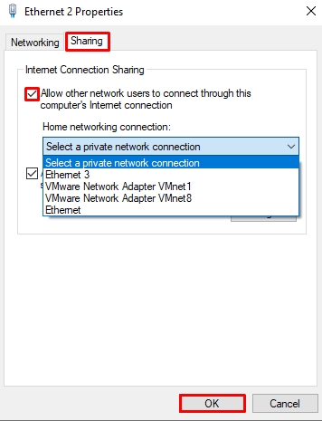 Open the Sharing tab. Check the option to allow other users to use this connection. In the dropdown, select the interface the console is connected to (usually Ethernet). Click OK to apply.